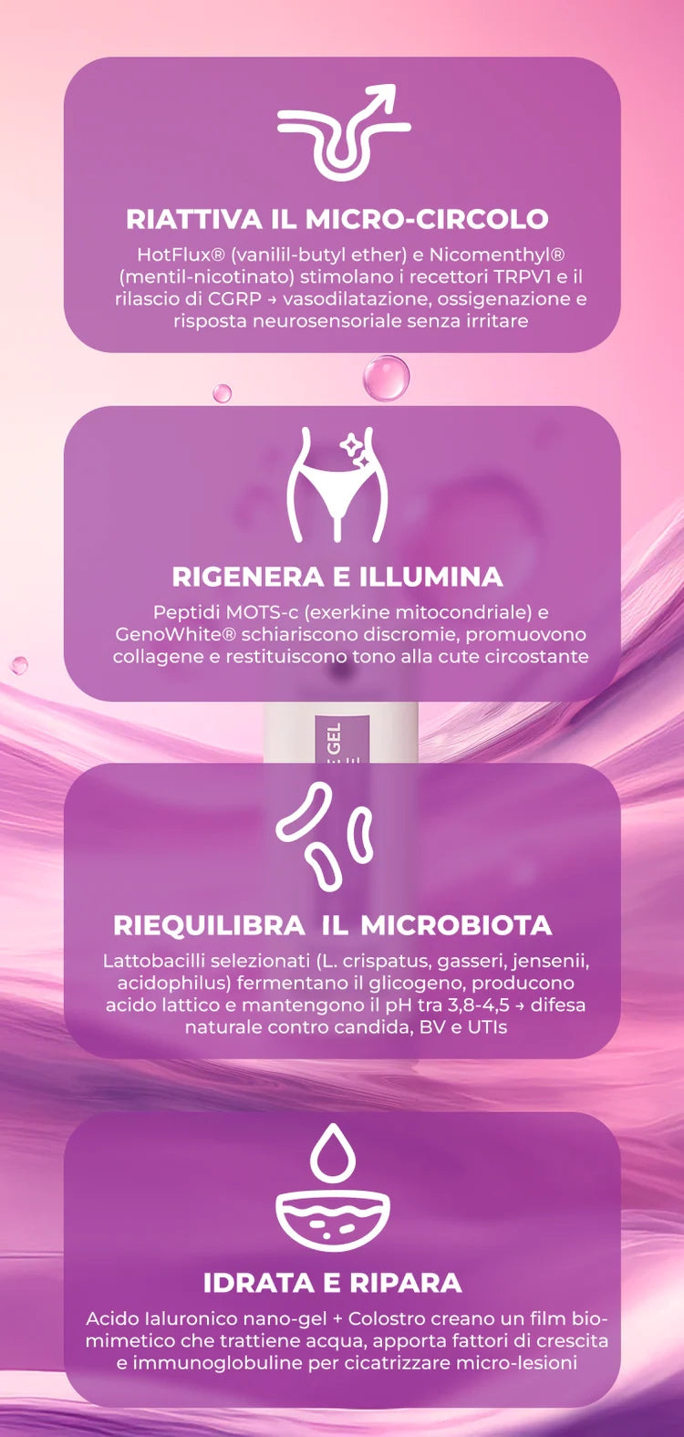 È un gel rigenerante per il trattamento delle zone intime, con una formula bioattiva a base di secretomi da colostro bovino, progettata per idratare, lenire e migliorare la salute cutanea e mucosale.